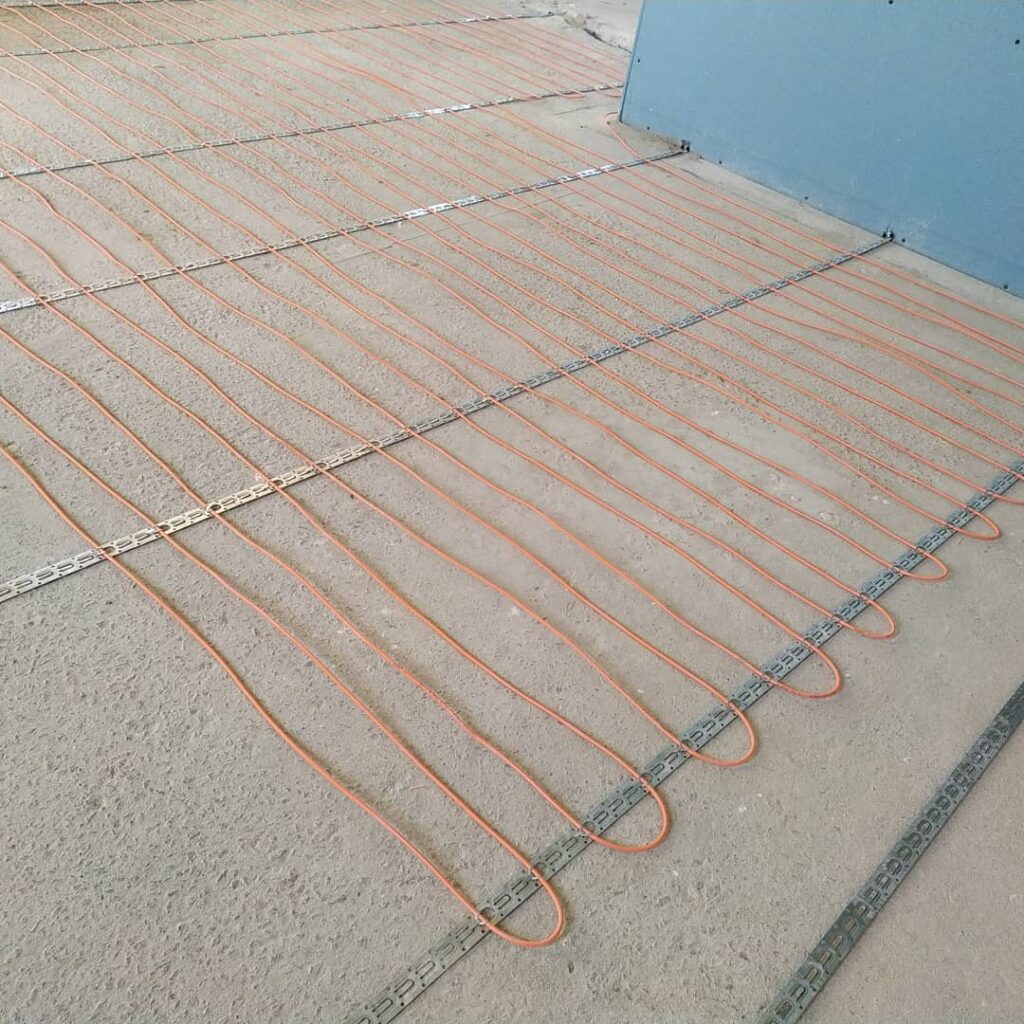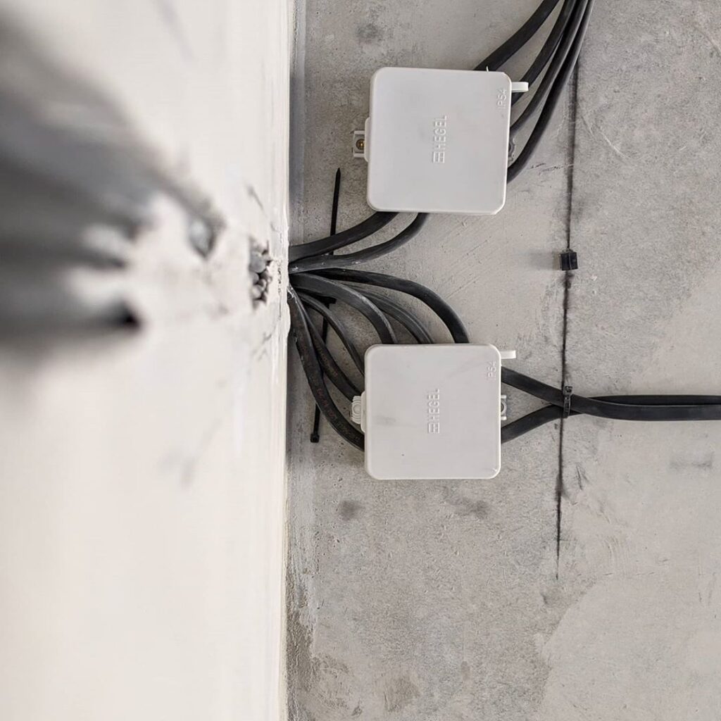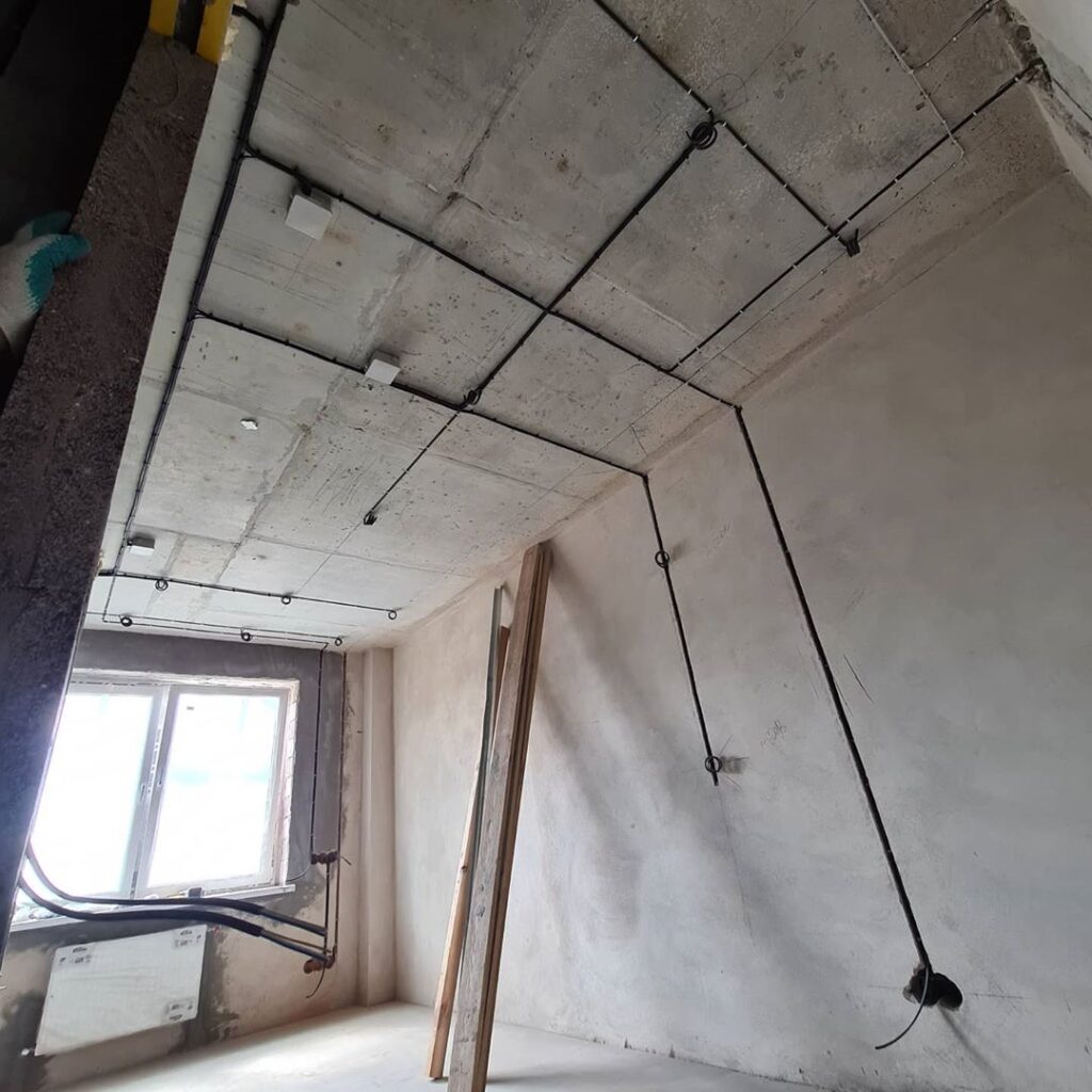 Проводка монтируется на этапе черновых работ, так как необходимо выбить штробы в стенах под электролинии и развести проводку по полу либо потолку. Затем перекрыть их стяжкой и штукатуркой.
